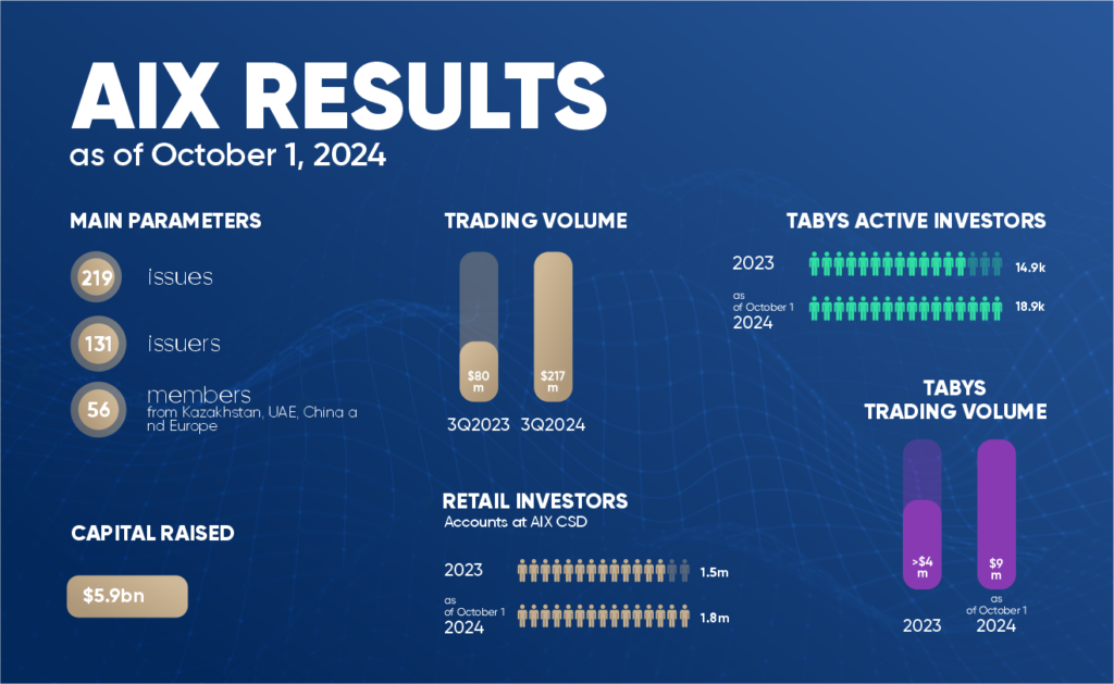 - There are currently 56 brokers of the AIX and members of AIX Central Securities Depository (AIX CSD); 22 of them are foreign companies from various European and Middle East countries, CIS, China and supranational organization. In 3Q2024 Investment company Standard (Kazakhstan), Abylai Global Solutions (AIFC), Roemer Capital (Cyprus), KIT Finance and Piter Trust Investments Company (both from Russia) were onboarded as AIX and AIX CSD members. Besides that, Eurasian Bank (Kazakhstan), ITS CSD and RCS Trust and Corporate Services (both from AIFC) were onboarded on AIX CSD as custodians at the AIX CSD.