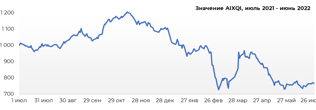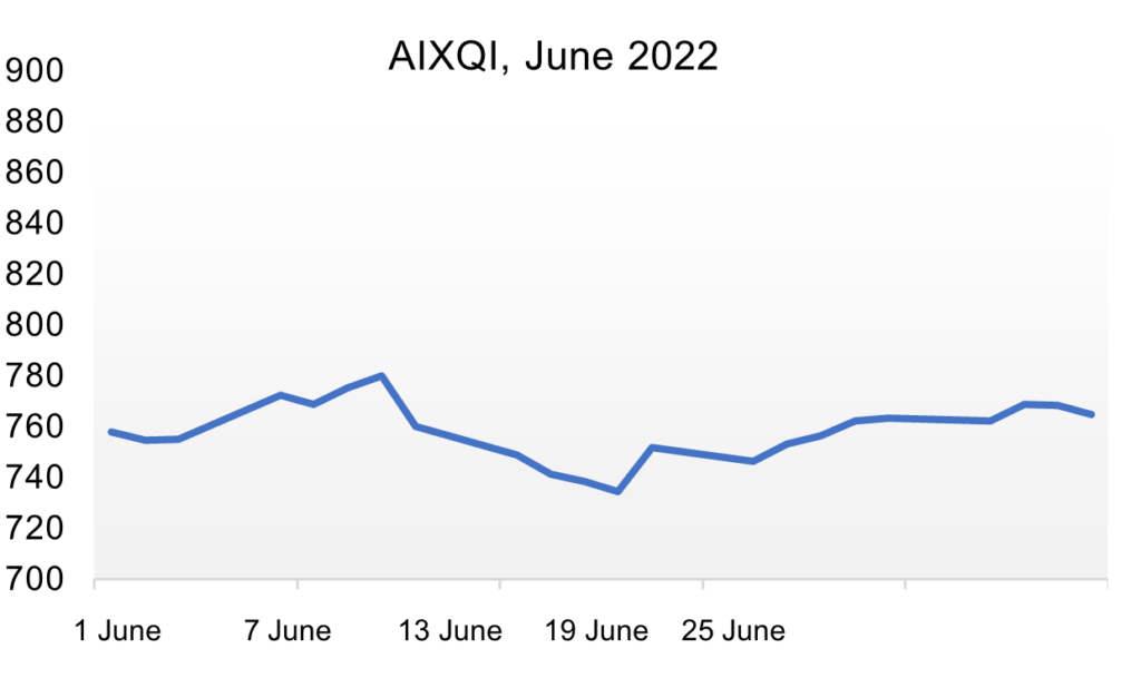 The Kazakhstan stock market continues to show very volatile results. At the end of June 2022, the AIXQI index increased by 1.41%, from 754.22 to 764.87. 4 out of 8 companies in the index ended the month in the green zone, 3 of which showed double-digit growth rates.