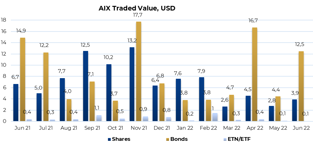 In June 2022, the trading volume on AIX was $16,444,269, a 2.2 times increase compared to the previous month. The reason for the upward trend is a sharp rise in the trading activity of debt instruments and Kazatomprom GDR and shares and Kaspi.kz GDR.