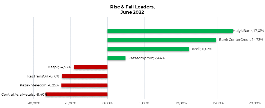 Shares of Halyk Bank were among the leaders (+17.01%), the largest bank of Kazakhstan issued statements for the 1st quarter of 2022, according to which the bank’s net profit increased from 96.8 to 124.2 billion tenge compared to the same period last year. Similar good results were demonstrated by the Bank CenterCredit, which increased its net profit from 74.7 to 102.7 billion tenge by the end of the 1st quarter of 2022 compared to the 1st quarter of 2021, ultimately propelling l BCC shares up +14.73%. Kcell partially recovered its losses of the previous month (+11.05% for June) against the background of the publication of convincing results of Kazakhtelecom, its parent company, but at the same time, Kazakhtelecom shares declined by -6.25% at the end of the month. The positive dynamics of prices for uranium futures contributed to the growth of Kazatomprom shares (+2.44%). Kaspi.kz share price decreased (-4.53%), despite the growth of the company’s net profit from 74.7 billion tenge in the 1st quarter of 2021 to 102.7 billion tenge in the 2nd quarter of 2022. S&P Global affirmed its positive outlook and ’BB-/B’ credit ratings on Kaspi Bank, a core component of Kaspi.kz’s Fintech Platform. S&P cited sound asset quality, solid operating performance and strong growth in Kaspi.kz’s Payments and Marketplace Platforms. In June, KazTransOil shares lost -6.16% in value, due to the fact that the statements issued by the company turned out to be unconvincing for investors – net profit decreased from 16.7 billion at the end of the 1st quarter of 2021 to 10.2 billion tenge in 2022. Fitch Ratings has confirmed KazTransOil’s long-term foreign currency default rating at BBB- with a Stable outlook. Central Asia Metals shares lost ground in June (-8.40%) against the background of the continuing decline in prices for copper, lead and zinc, as well as due to the recessionary expectations of UK investors.