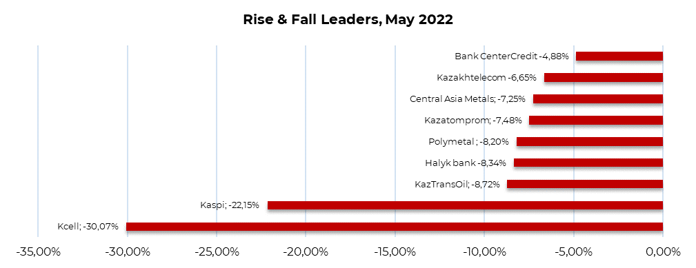 All index constituents closed the month on a negative note. Kcell shares declined the most significantly (-30.07%), the market negatively perceiving the decision to postpone the payment of dividends for the 2021 exercise. Kazakhtelecom (-6.65%) made this decision, basing its position on the unstable economic situation, currency risks and the need for Kcell to concentrate on capital expenditures. Due to the decision made to refuse to pay dividends, shares of companies in the banking sector of Kazakhstan declined: double-digit downward drops affected the share price of Kaspi.kz (-22.15%), on the back of Bank CenterCredit approved the payment of dividends in the amount of 26 tenges per share (or 2.4% per annum equivalent to an all-time low), as a result of which the shares of the oil pipeline operator closed May with a decrease of -8.72%. Despite the fact that Kazatomprom announced the payment of record dividends (876.74 tenges per share, or 5.2% per annum dividend yield), the shares of the national nuclear company lost -7.48%, as investors continue to assess the potential negative impact of geopolitical tensions on the company’s business.