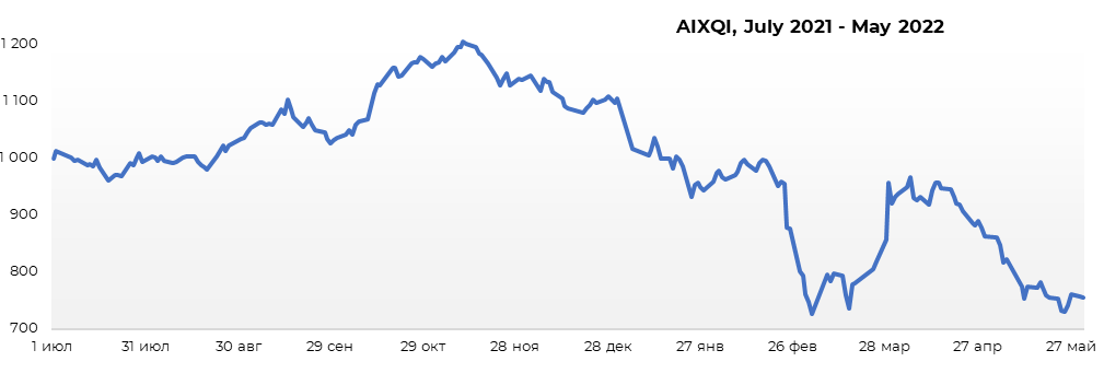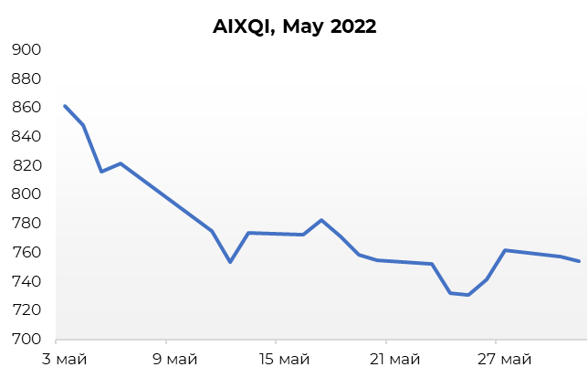 In May, there was a significant decline in the AIXQI benchmark index (by -12.65%), from 863.49 points to 754.22 points. The stock prices of Kazakhstani companies continue to be under pressure against the background of increased volatility in stock markets, resulting from the “hawkish” orientation of monetary policy of the world’s largest central banks, recessionary fears, tense geopolitical situation and a decrease in the dividend yield of large Kazakhstani companies.