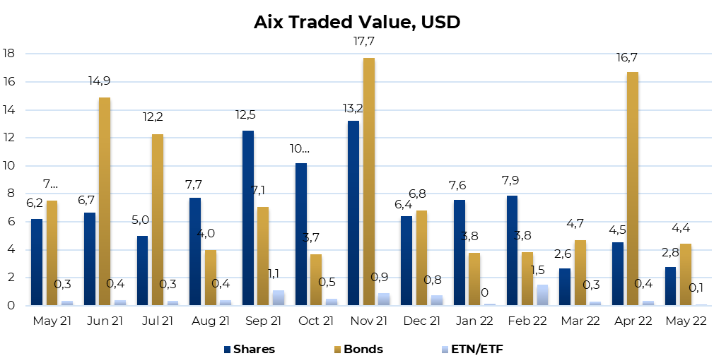 As of the end of May 2022, the official AIX list includes 127 issues of securities by 85 different issuers, including 17 ETNs (Exchange Traded Notes). AIX trading members are 18 Kazakhstani and 12 international brokers. More than 319 thousand investor accounts have been opened with the AIX CSD.
