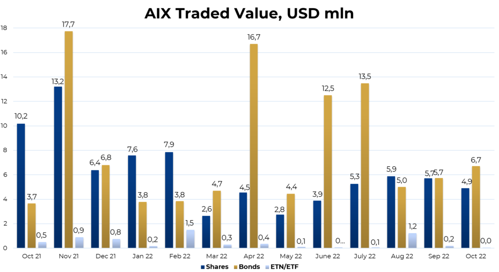 The growth leader among the components of the AIXQI were the shares of Kaspi.kz, which ended the month with an increase of 10.78%. At the end of the month, the company reported third quarter 2022 results, which were exceeding expectations – revenues increased by 40%, and Kaspi’s net profit increased by 36%. In addition to announcing positive financial results, the company announced the approval by the Board of Directors of the dividend for the third quarter of 2022 in the amount of 600 KZT per share. According to the results of the previous quarter, the company paid 500 KZT per security.